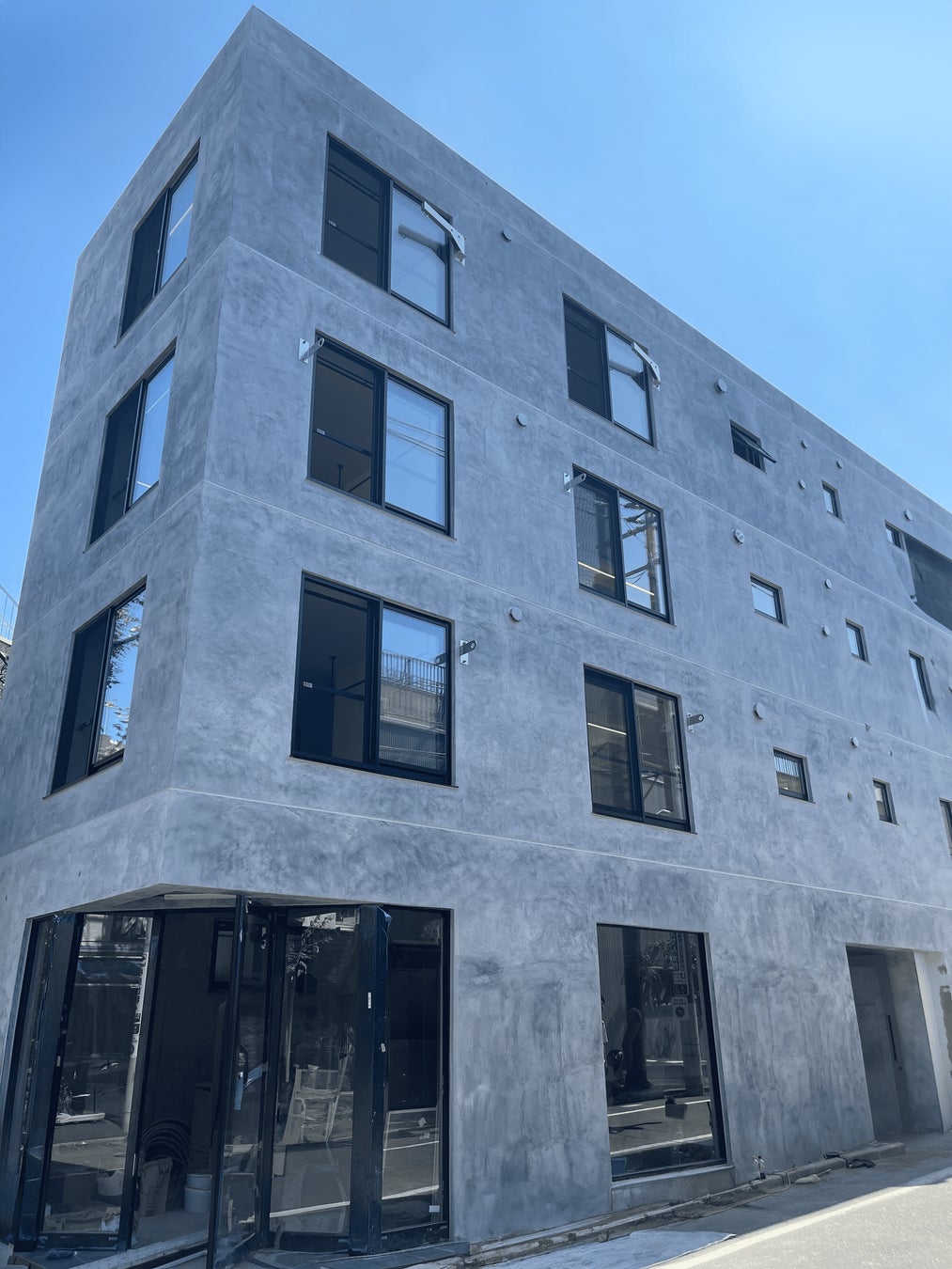 本建物はあえて外観は凹凸がなくすっきりとした印象だが、ジョリパッドに本物の炭を混ぜ、金鏝でランダムに荒らすという難易度の高い施工に挑戦し、黒とグレーの陰影を付けることで存在感を出すことで、アートな空間に吸い込まれていくようなプロダクトを目指した。