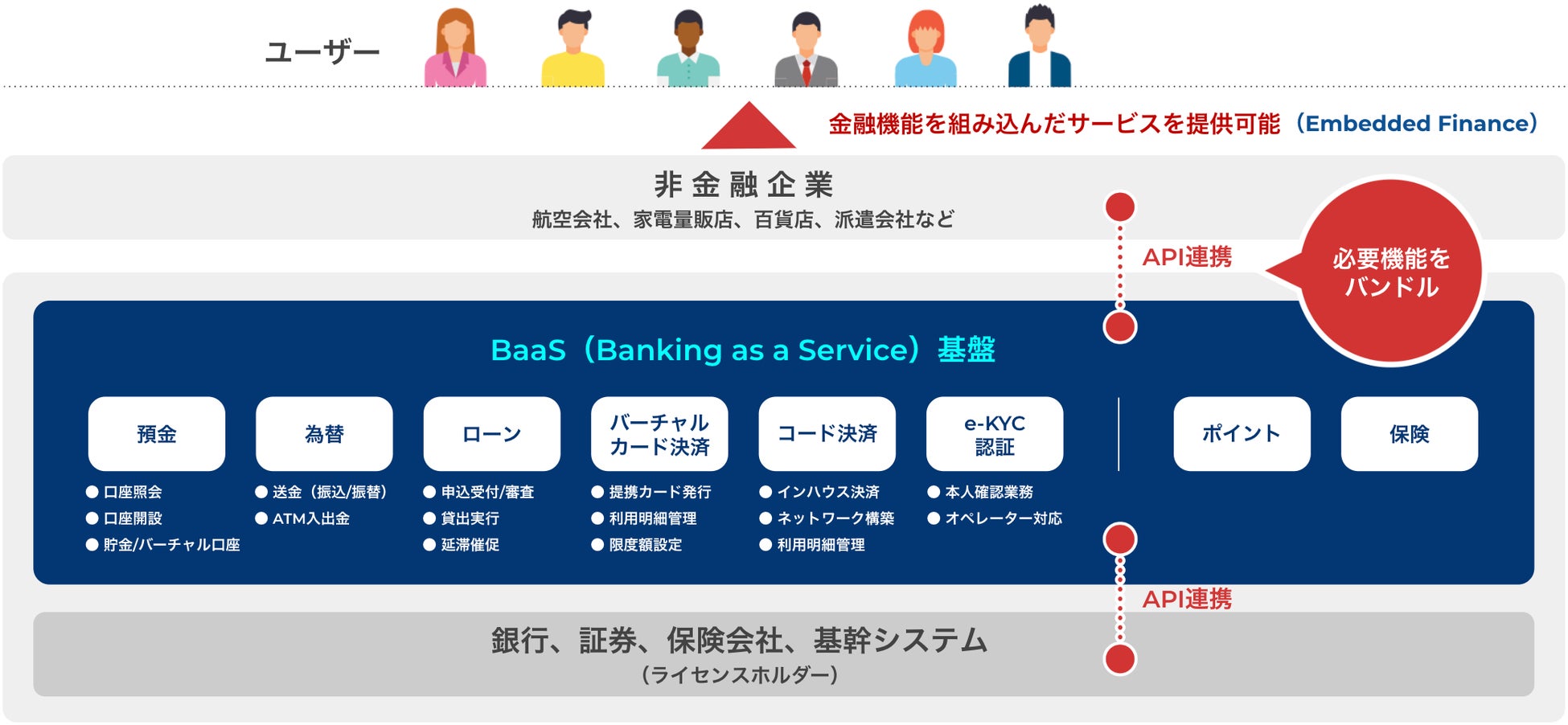 BaaS (Baking as a Service) は、非金融事業者が金融事業を提供可能にする、金融機関が提供するAPIソリューションです。このサービスを活用することにより、非金融事業者が金融プロセスを含む業務を自社のサービスに取り込むことが可能となり、顧客に向けたより利便性が高いサービスの提供に繋がります。