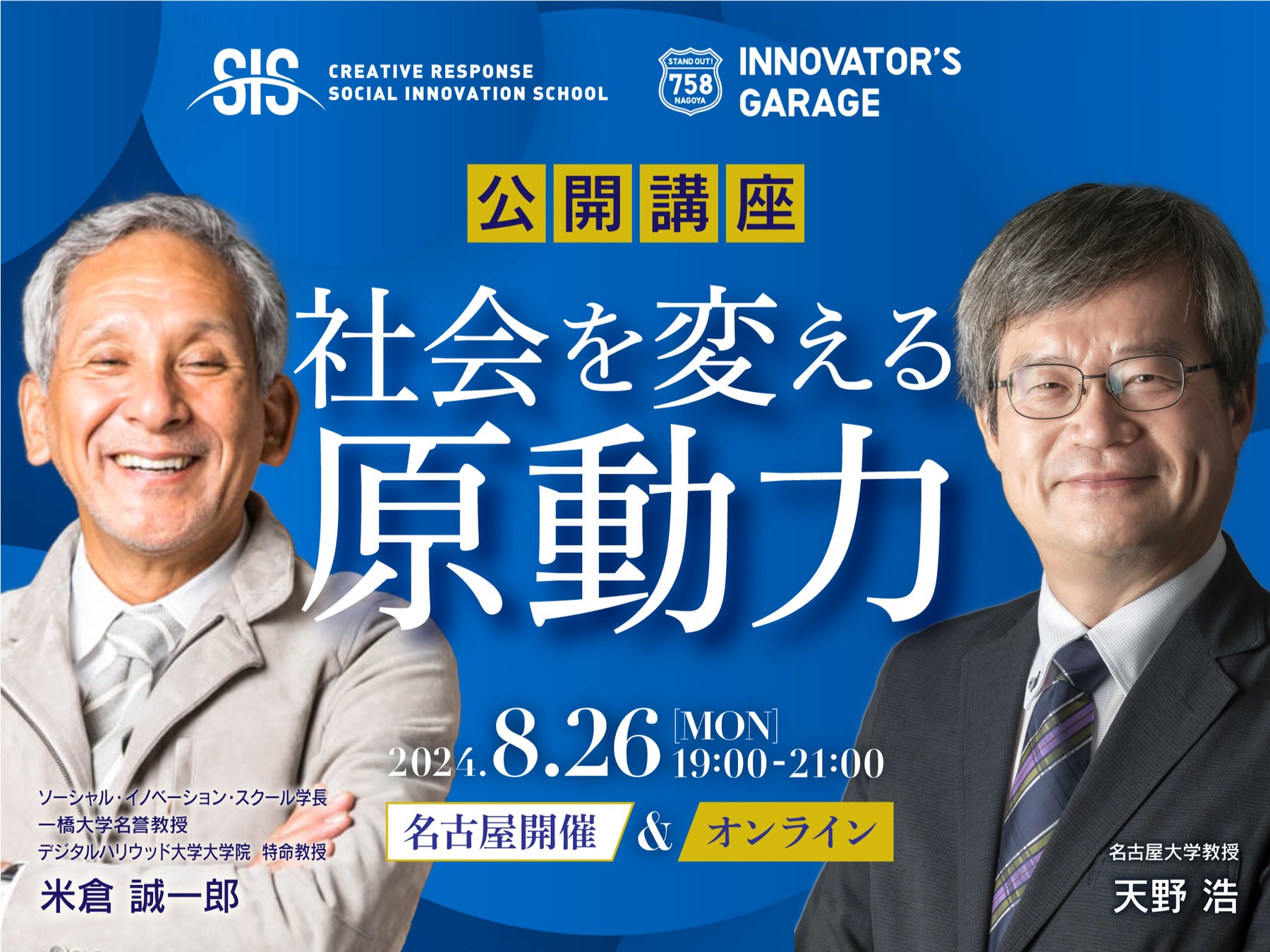一般社団法人 Creative Response(代表理事:米倉誠一郎)は、ノーベル物理学賞受賞の天野浩教授を迎え、8月26日(月)19時よりナゴヤ イノベーターズ ガレージ(名古屋市内)にて特別公開講座を開催します。