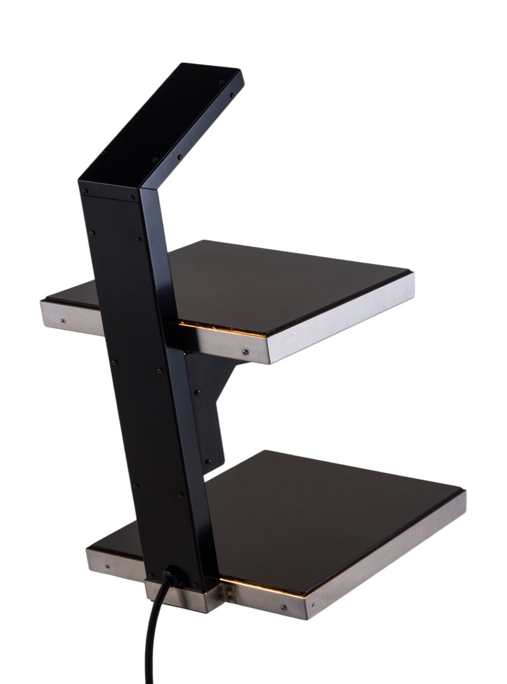 2段式プレートヒーターは、既存のプレートヒーターと比較して面積比は小さめですが、2段ある分、製作工程や部材も2倍を必要とします。原材料高騰の影響も受け、コスト削減に悩みながらも、視覚的にも魅力的なビュッフェラインを実現するために、妥協せずに取り入れたモノの一つがLED照明です。LED照明の色味や明るさには特にこだわり、温かみのある黄色系の電球色を採用しました。これにより、遠くからでもお客様の目を引き、温かい料理の美味しさを引き立てます。さらに、料理が主役となるように柱を極力目立たない位置に配置し、使い勝手を考慮したデザインによって、機能性と美しさを両立させています。私は、このプレートヒーターが皆様の期待を超える製品であると確信しています。お客様が思わず立ち寄りたくなるような魅力的なビジュアルと、優れた使い勝手を兼ね備えたこの2段式プレートヒーターを、自信を持ってお勧めします。(開発部:S氏)
