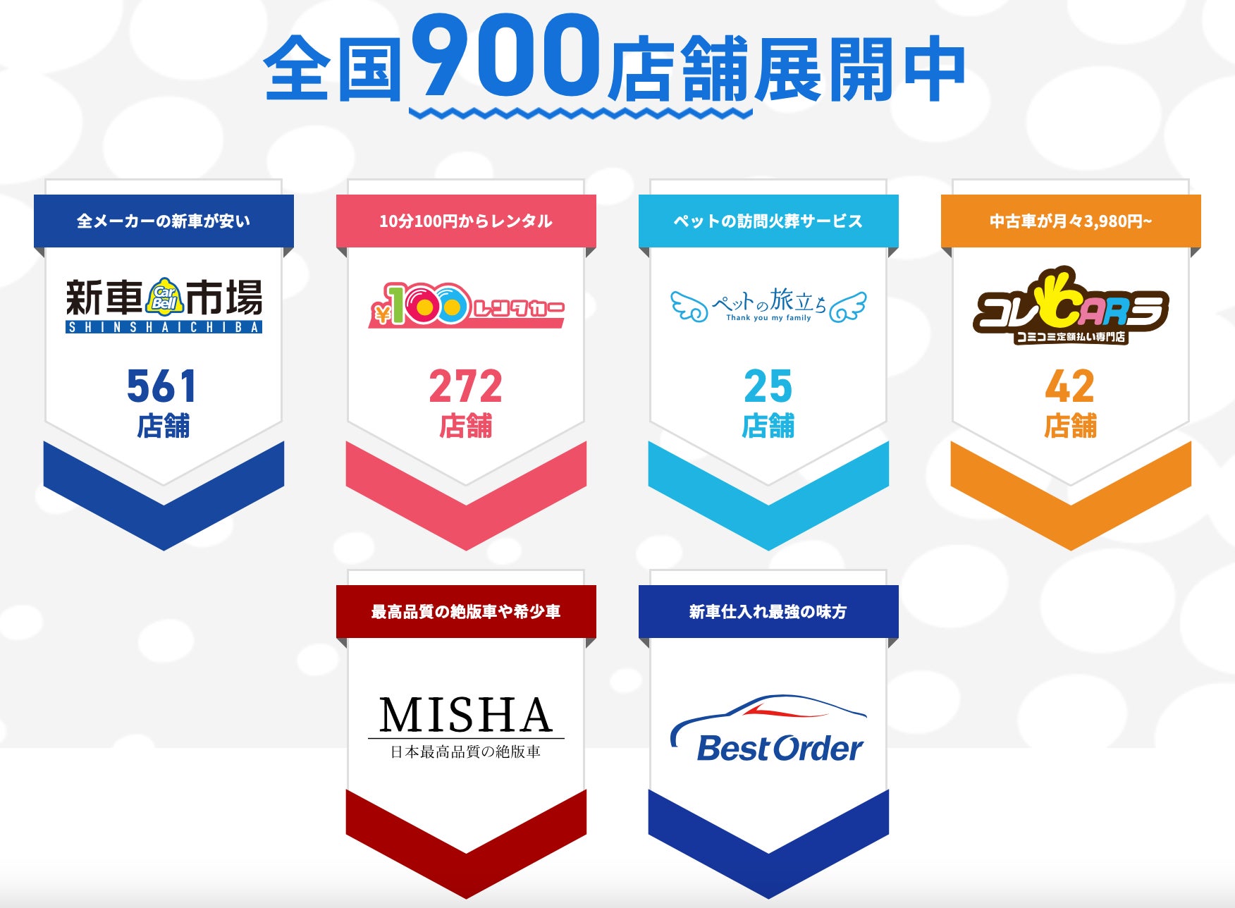 全国の自動車販売店を組織しブランド化することで、店創り、人創りを推進するコンサルティング企業です。「新車市場(しんしゃいちば)」561店舗、中古車サブスクリプション「コレCARラ」42店舗のほか、レンタカー事業「100円レンタカー」272店舗、ペット訪問火葬サービス「ペットの旅立ち」28店舗、絶版車販売「MISHA」、GT-R専門店「R35garage」などを手がけています。