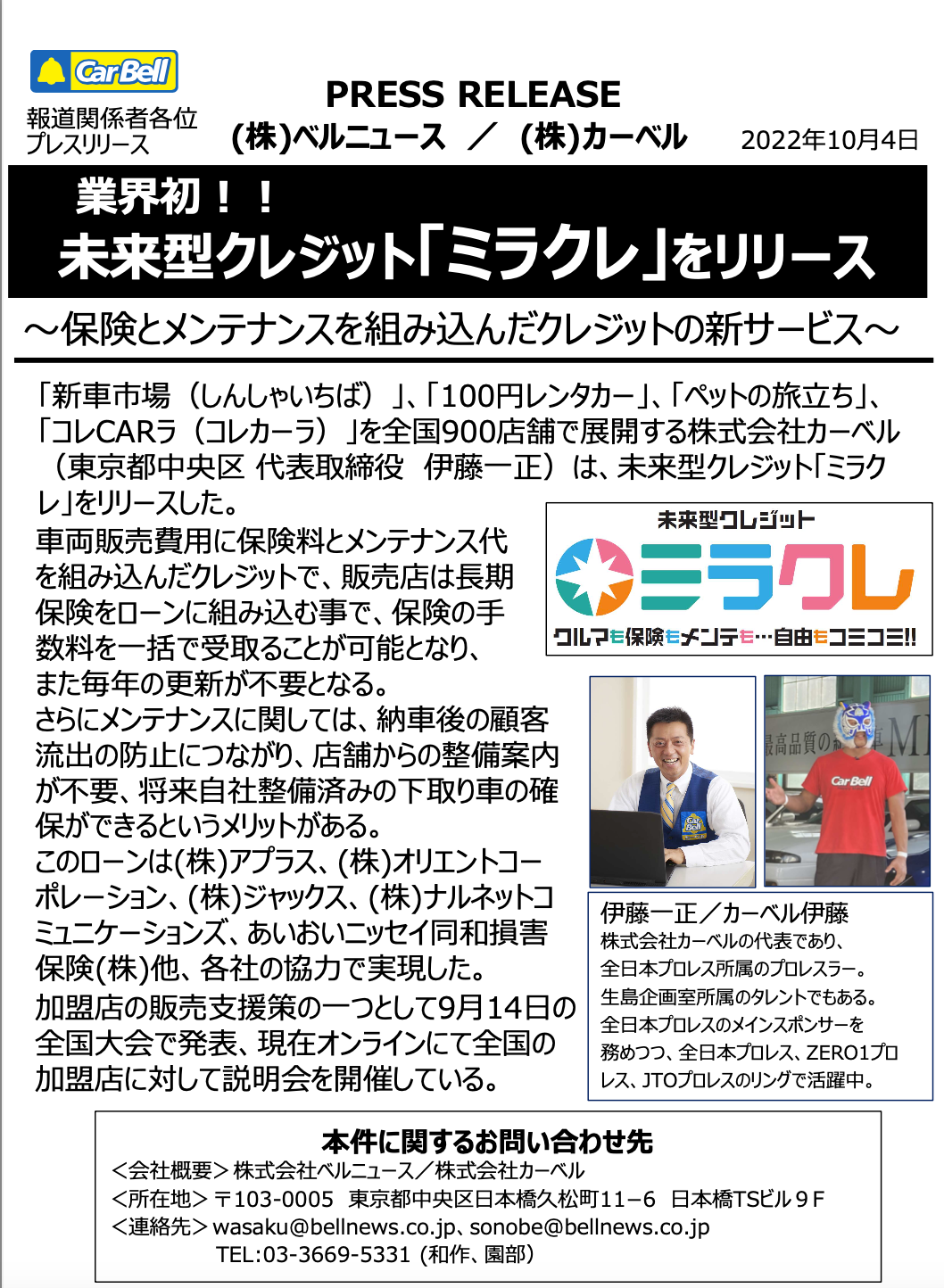 自動車販売のカーベルが推進する未来型クレジットサービス「ミラクレ」にナルネットコミュニケーションズが「メンテナンスパック」を提供