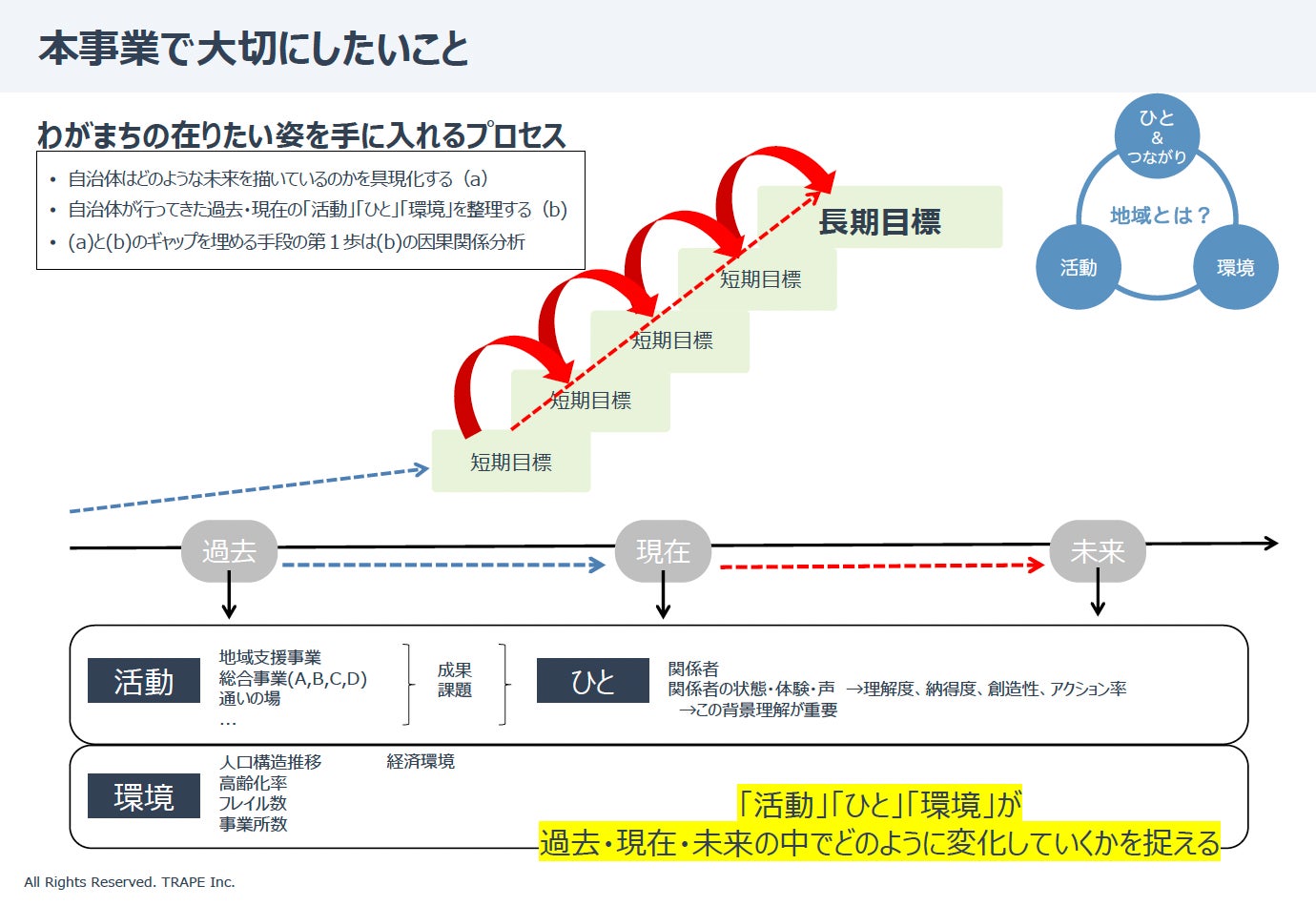 現在の状況や過去の出来事を「ひと」「活動」「環境」という視点で整理・解釈し、未来には手に入れたいわがまちの在りたい姿(長期目標)に向かうための段階的なマイルストーン(短期目標)を設定していき、1段ずつ登っていけるデザインづくりを行う