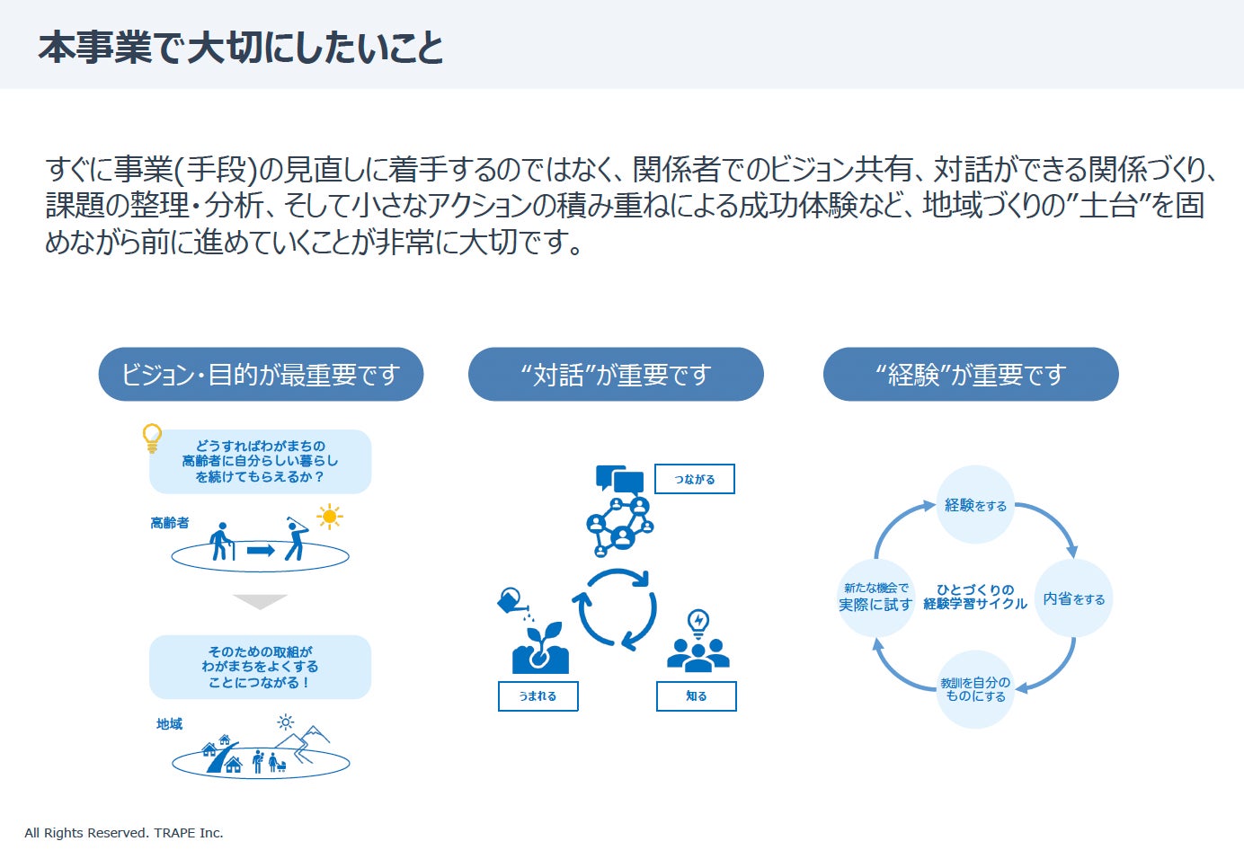 すぐに手段である介護予防・日常生活支援総合事業の見直しに取り組まず、関係者でのビジョン共有、対話ができる関係づくり、課題の整理・分析、そして小さなアクションの積み重ねによる成功体験など、地域づくりの”土台”を固めながら前に進めていくことを大切にしていく。