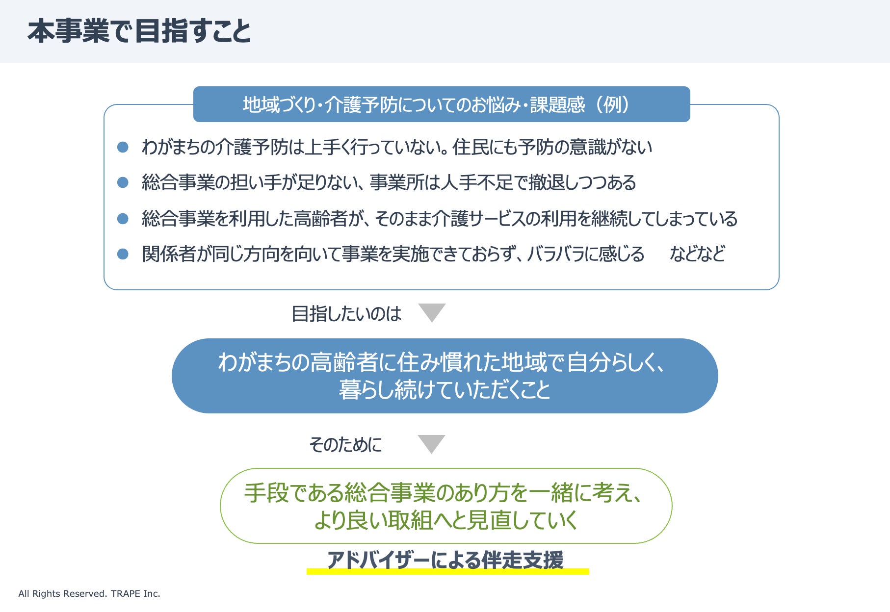 地域づくり・介護予防についてのそれぞれの市町の課題感、目指したいわがまちの姿をアンケートや対話を通し明確にし、手段である介護予防・日常生活支援総合事業などのあり方含めて一緒に考え、より良い地域を作るために多様な視点で見直しを行なっていく。