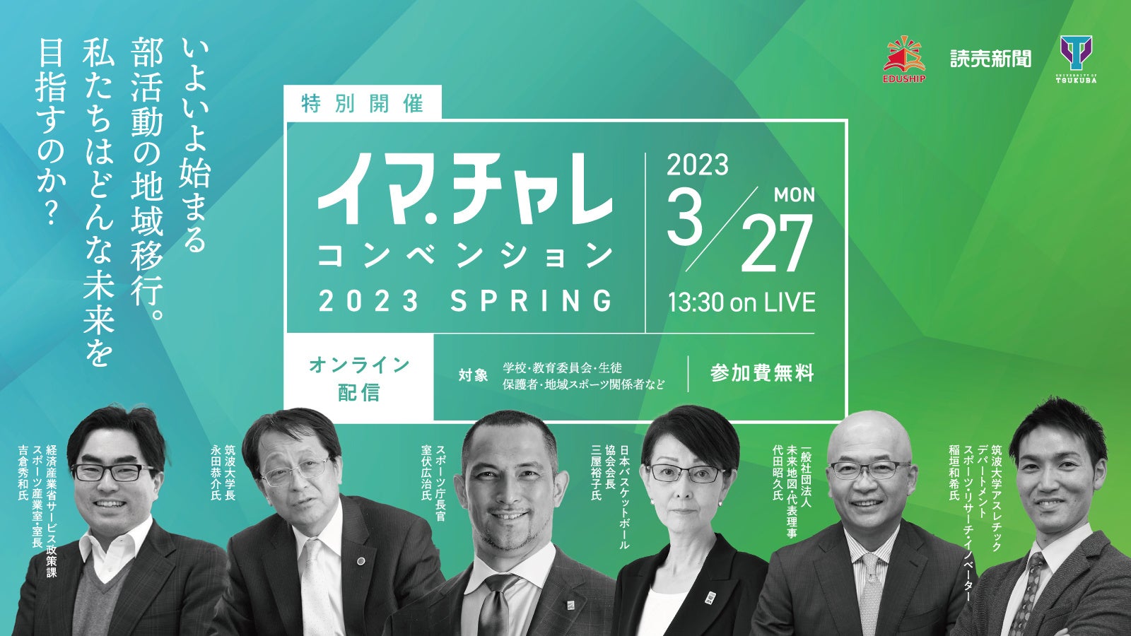 イマチャレ製作委員会(主管企業・団体:EDUSHIP株式会社、筑波大学アスレチックデパートメント、読売新聞東京本社)は、学校スポーツ改革(部活動改革)をテーマとした「イマチャレコンベンション2023SPRING」を3月27日(月)13:30~オンライン開催いたします。全セッションの内容と登壇者が決定しましたので、公開いたします。