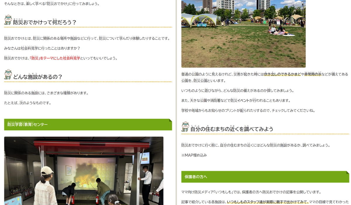 子ども向けページ「防災おでかけに行ってみよう」は、言葉使いや文章の長さなどを調整し、小学校3年生前後から自分で読めるような内容としています。