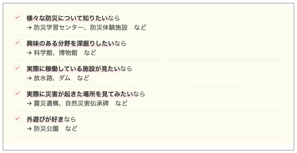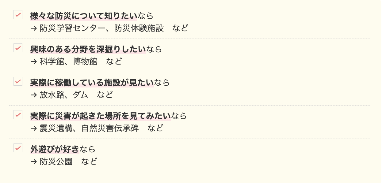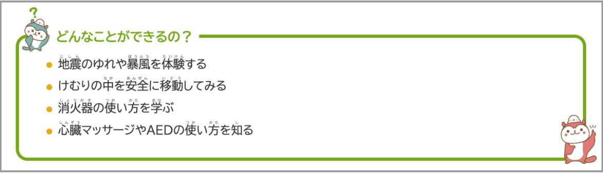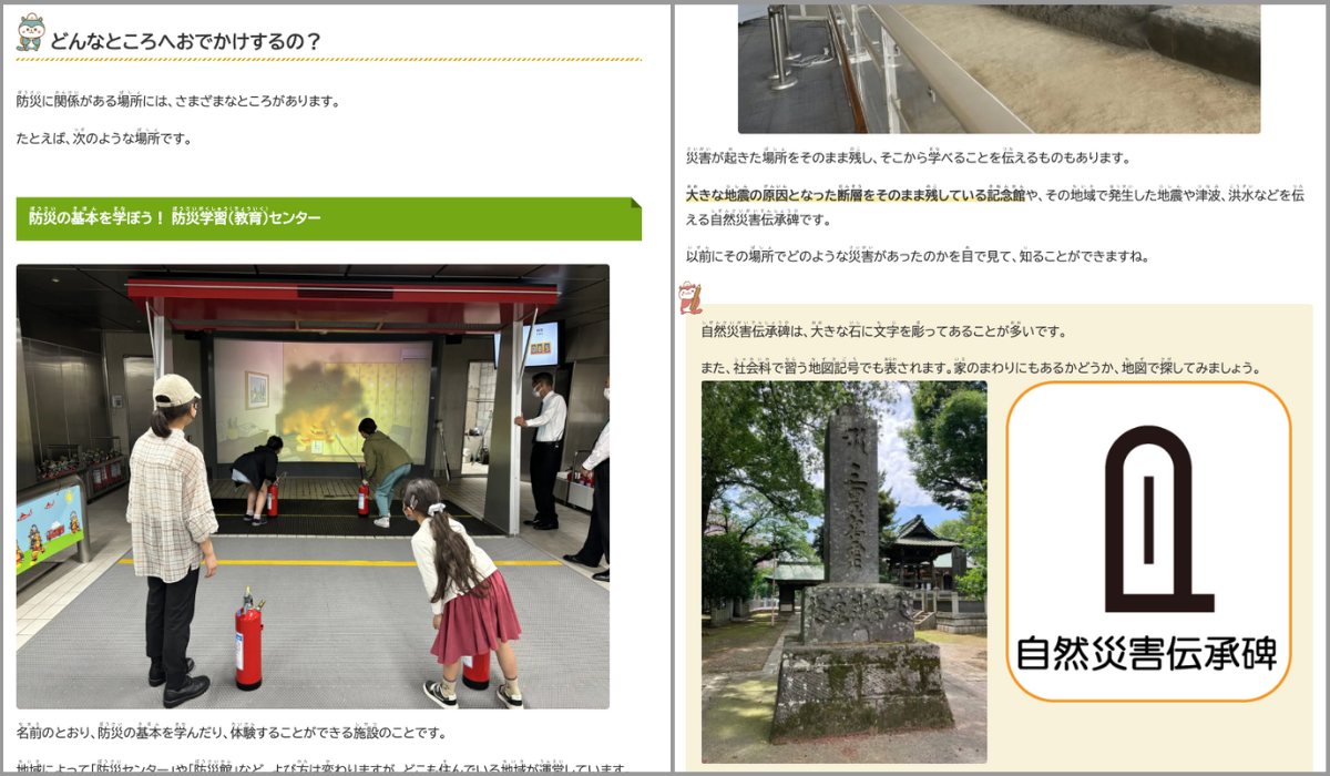 また、「防災施設に行ったことがない」「どういう所なのか想像できない」という子でもイメージが湧きやすいよう、防災施設とはどういった場所を指すのか、画像と共に具体例を挙げて紹介しています。
