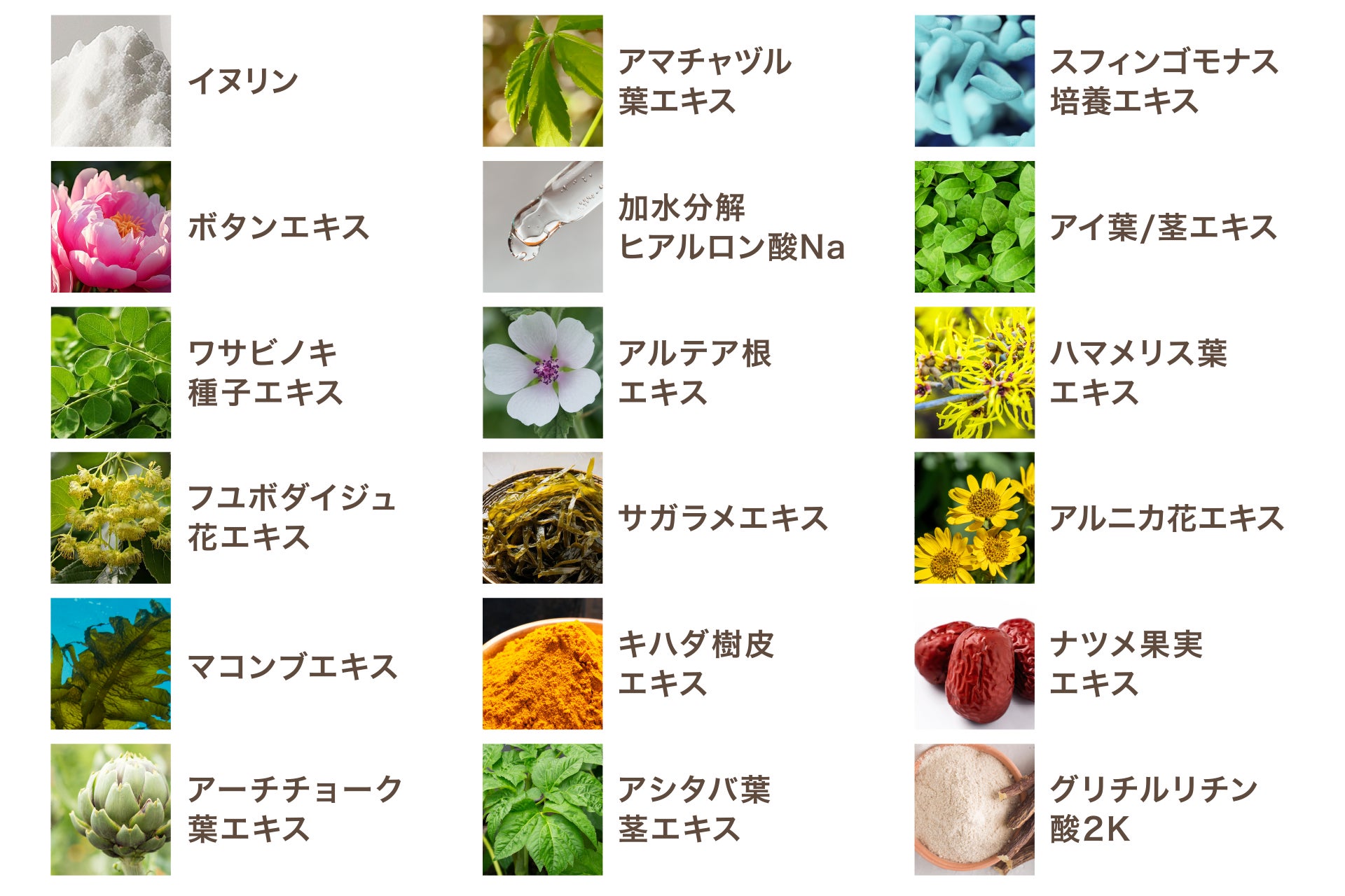 18種類の天然由来の美容成分を贅沢に配合。イヌリン、アマチャヅル葉エキス、スフィンゴモナス培養エキスなど、肌に潤いを与え、健やかに保つ成分を厳選。