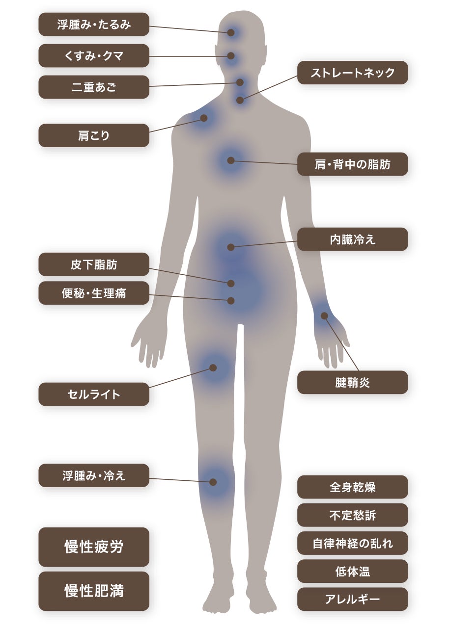 実際に、今から約50年前の日本人の平均体温は36.9℃でしたが、現代人の平均体温は35.8℃~36.2℃と約1℃も低下しており、その結果、多くの人がむくみ、冷え、肩や首のこり、肌荒れ、便秘、慢性的な疲労感、そしてなかなか痩せられないといった、様々な悩みを抱える方がいらっしゃいます。