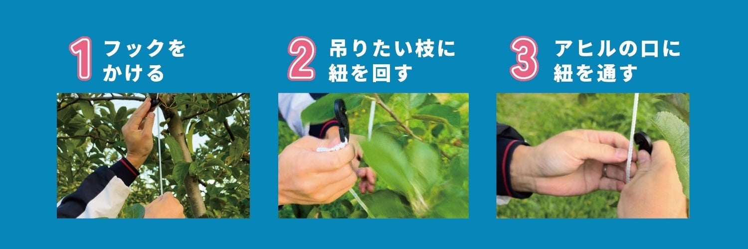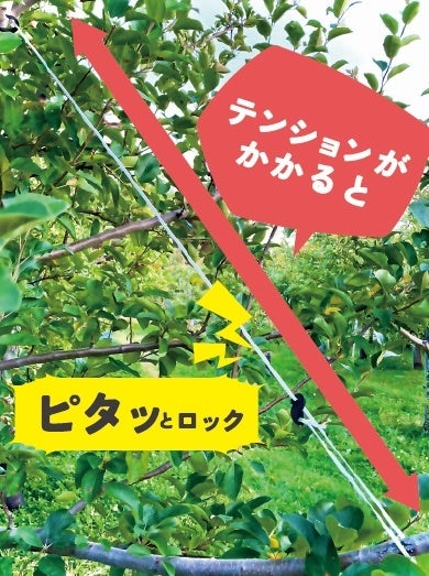 従来の枝吊り、誘因作業は紐などで長さの調整をしながら縛る、いわゆる一発決め方式ですが、フリーフッカーは縛る作業はなく掛ける方式です。そののちに長さ調整ができます。それゆえに、例えば太陽光をまんべんなく当てるために、枝の位置を調整したいときも張りの長さを変えて枝の位置を調整することも簡単に可能です。