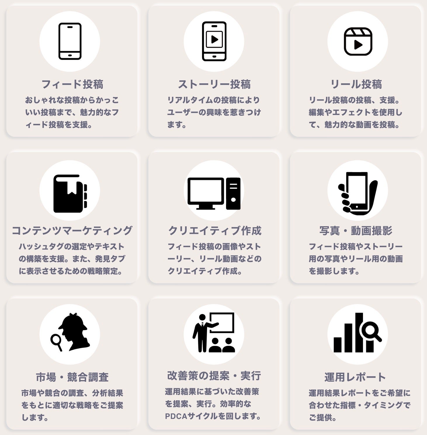 フィードやストーリー、リールの投稿やそれぞれのクリエイティブ制作、投稿戦略や企画の策定、コンテンツマーケティング、市場・競合調査、運用レポートの作成など、幅広いサービスを提供しています。