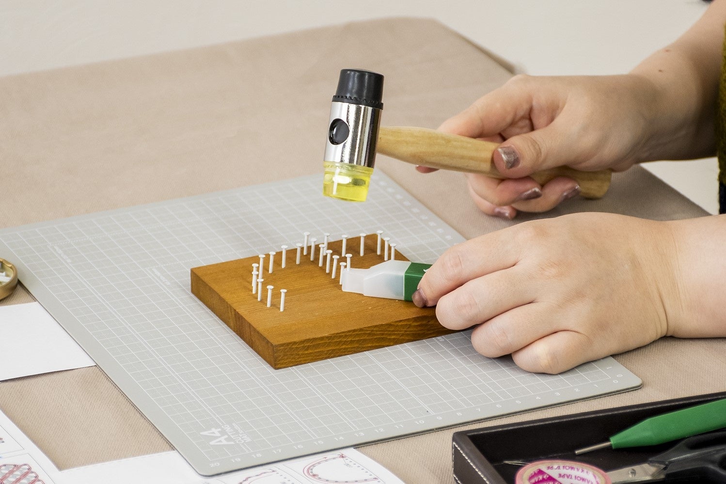 板に釘を打ち込みます。付属のネイルガイドを使えば釘を直接持たずに釘打ちができます。ハンマーで手を打つ心配が減るため、釘打ちがはじめての方でも安心して楽しむことができます。