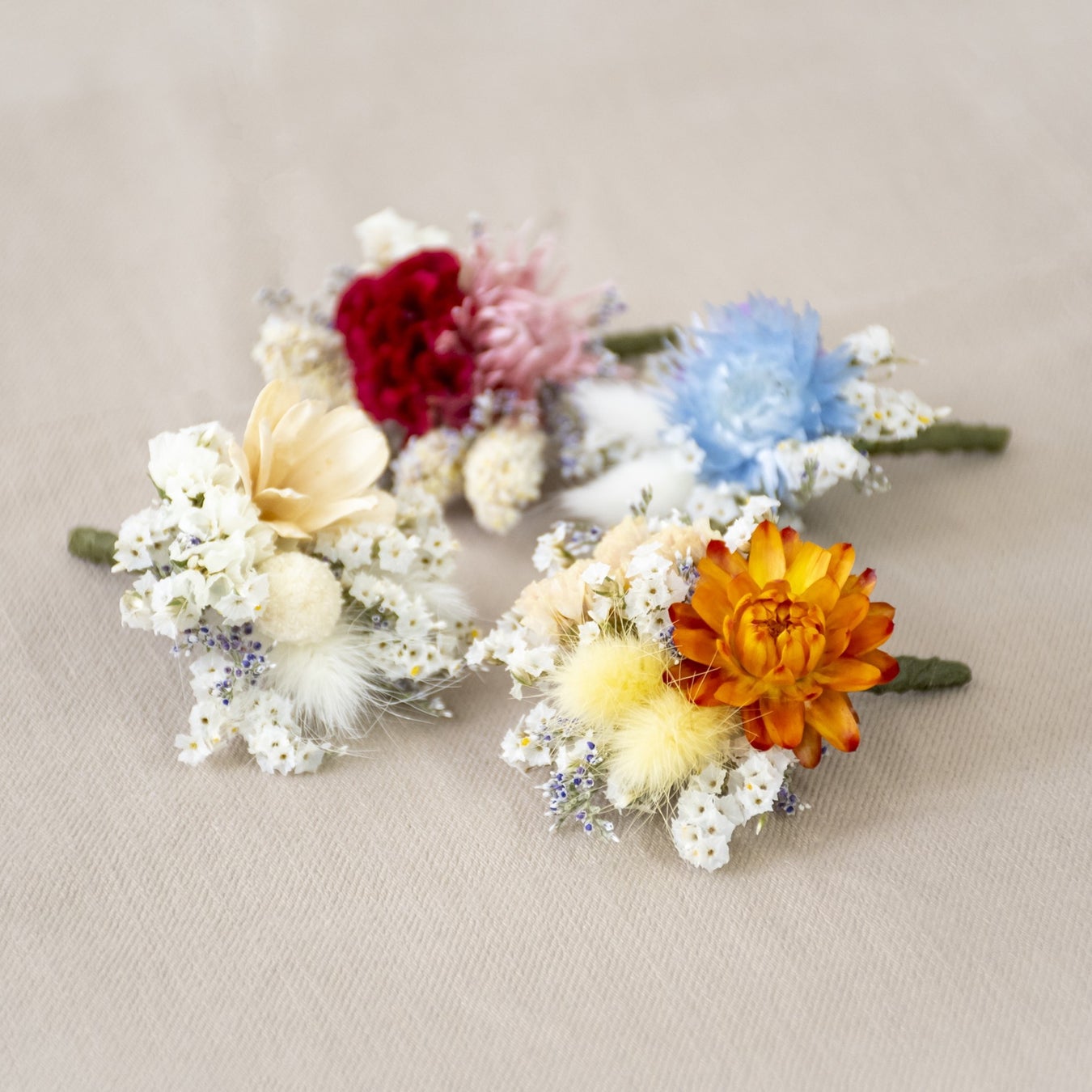 ブーケは4つのカラーをご用意しました。同じ色系統でも季節によって使われる花が異なります。一点一点心を込めて手づくりしてお届けいたします。