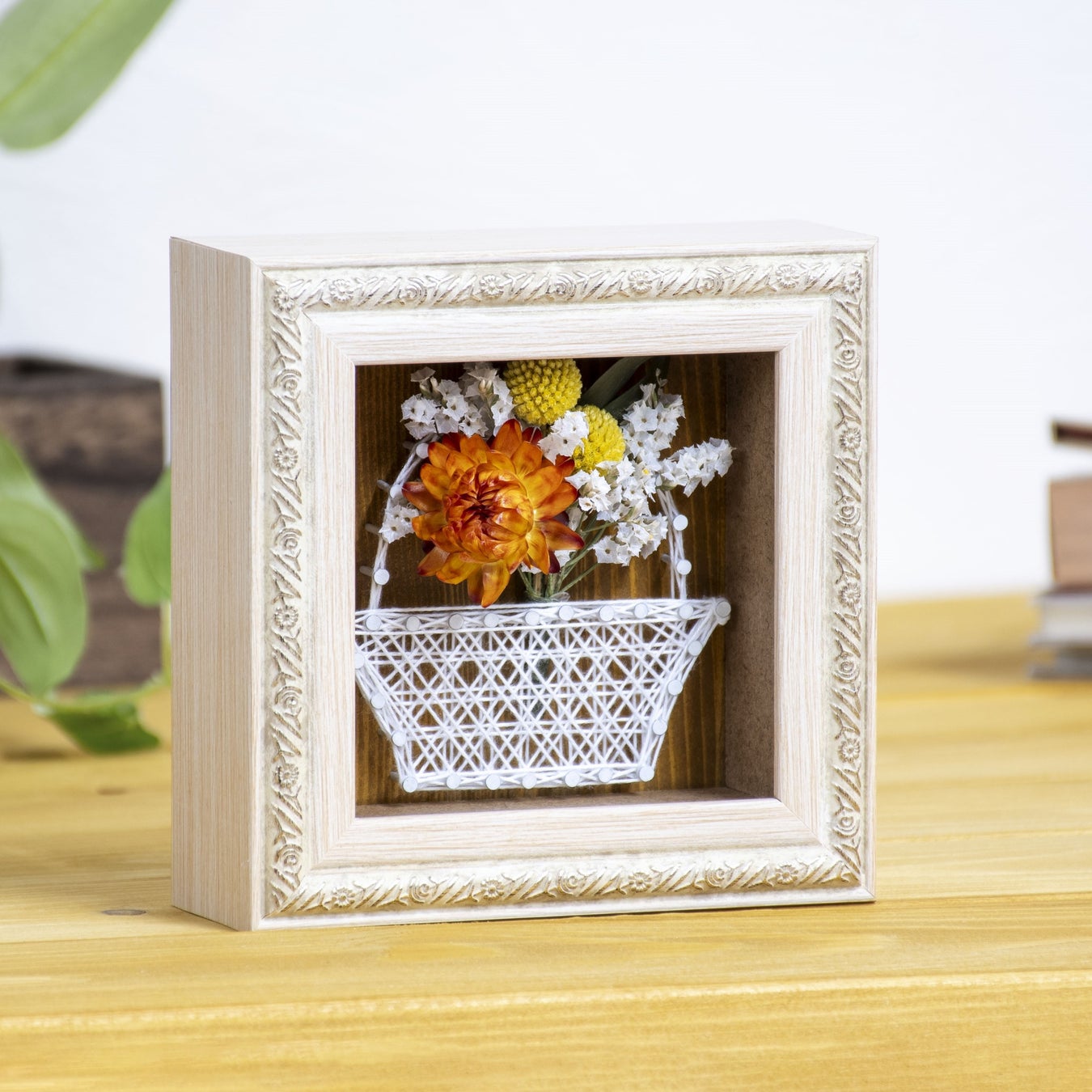 好きなカラーを選択したドライフラワーに、釘と糸を使って自分の手で作った「かご」デザインの作品を組み合わせることで、自分だけの特別なオリジナル作品が誕生します。手づくりならではの独自性や温かみを感じられるはずです。