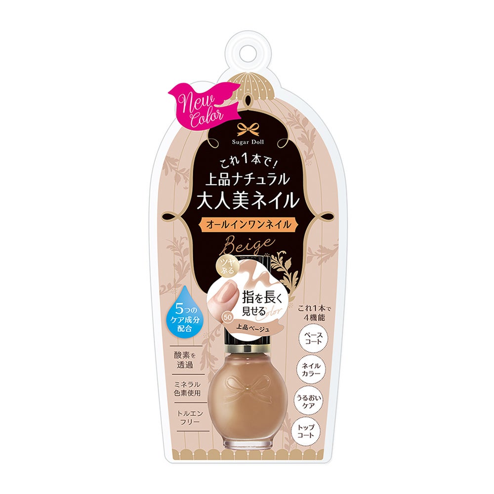 ひと塗りで簡単に、指先をキレイに仕上げる「シュガードール オールインワンネイルR」は 50 上品ベージュが加わり、全5色のカラーラインナップへ。