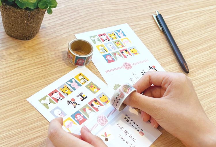 紙製テープを貼るだけで簡単に年賀状をデザインできちゃいます