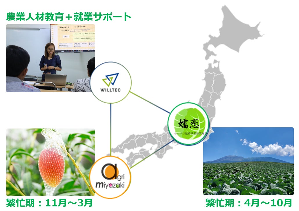 この度、宮崎県農業法人経営者協会および群馬県の嬬恋キャベツ振興事業とウイルテックによる三者間協定を締結しました。春先から秋頃にかけて繁忙期を迎える嬬恋村のキャベツ農業と、晩秋から春先までが繁忙期となる宮崎県のハウス農業の間で「産地間人財リレー」を行うことを目指しています。そこに、わたしたちが有する海外人材への教育ノウハウや採用から出入国までの手続きサービスを組込み、また、海外人材に対しては日本での生活サポートまで実施してまいります。