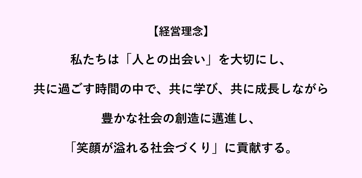 持続可能な社会の実現に向けて、多くの産業や地域社会に貢献し、全てのステークホルダーに感動と笑顔を提供する。人との出会いを大切にし、共に学びながら「笑顔が溢れる社会づくり」という夢の達成に向け、わたしたちはこれからも邁進し続けてまいります。