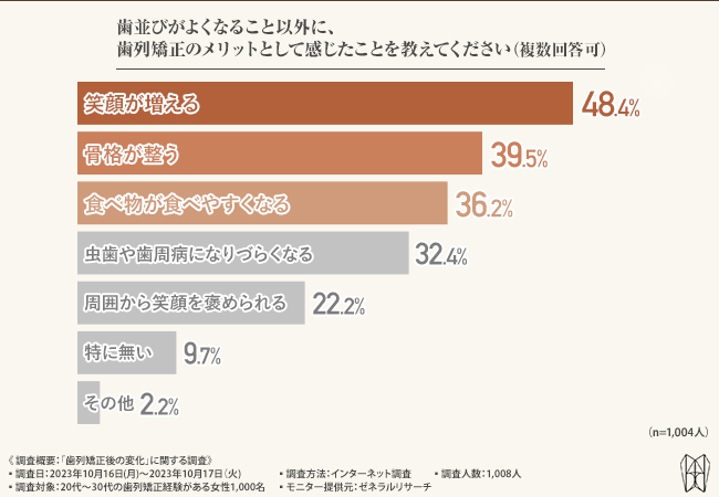 およそ半数の方が、歯列矯正は笑顔が増えることがメリットだと回答しています。