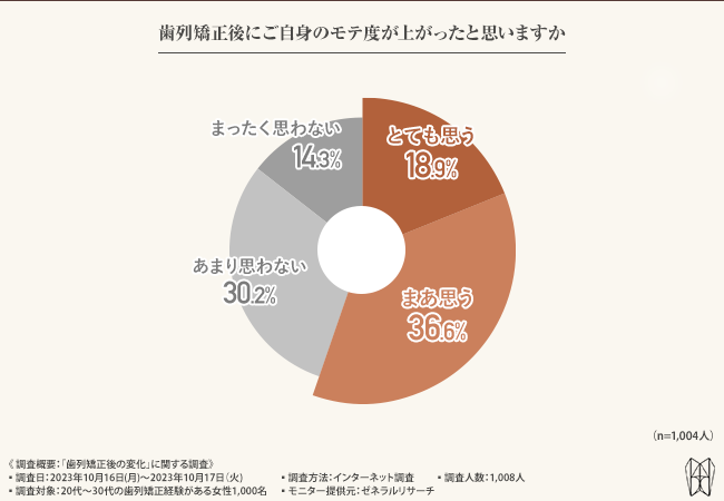 今回の調査で、歯列矯正後の反応は同性・異性を問わず好意的であることが明らかになりました。約55%の方が、歯列矯正後にモテ度が上がったと回答しており、歯並びの良さは異性の目から見ても魅力的に映るようです。