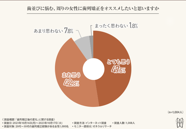 「歯並びに悩む、周りの女性に歯列矯正をオススメしたいと思いますか」と質問したところ、『とても思う(47.6%)』と回答した方が最も多く、次いで『まあ思う(42.8%)』『あまり思わない(7.8%)』『まったく思わない(1.8%)』と続きました。