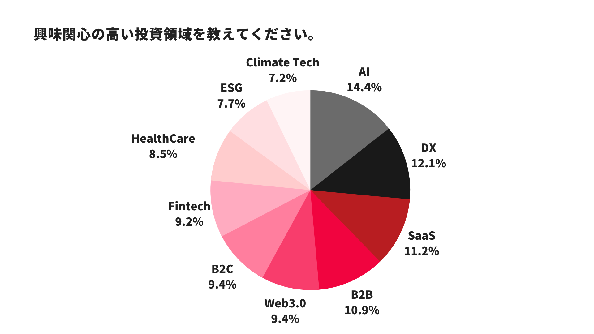 興味関心領域で最も高かったのはAIであり生成AIのパラダイムシフトに注目していることがわかります。それと同時にSaaSについても根強い人気がありました。一方、Web3とtoC についてはやや注目度は弱まっているようです。