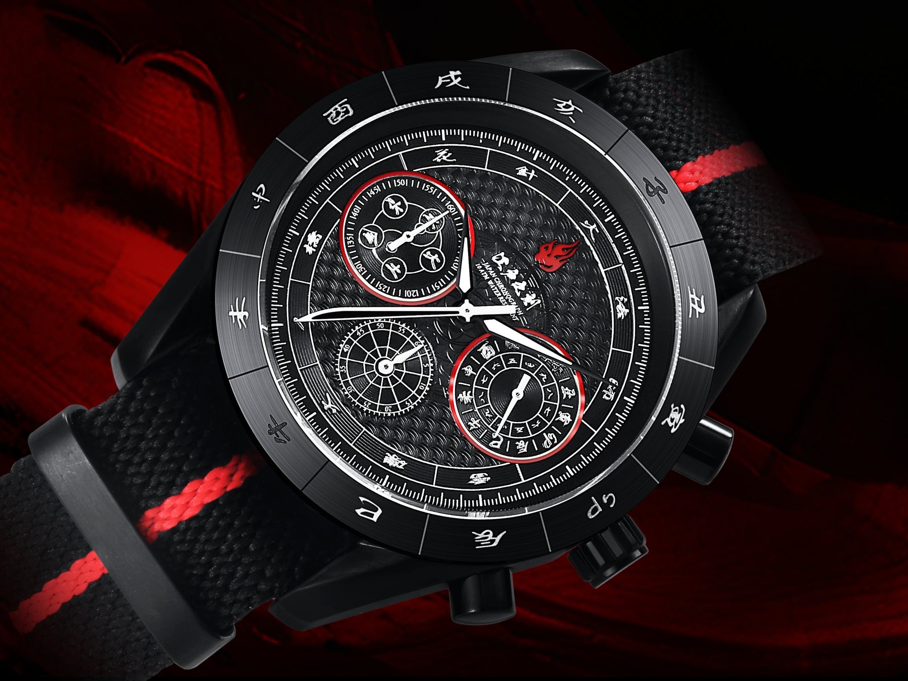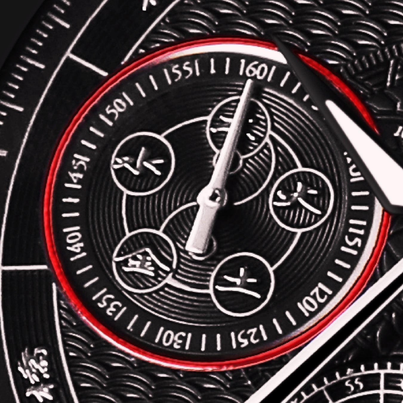 文字盤には、十二支と数で時刻を表す独自のデザインが施され、そこには画眉丸の忍術が秘められています。炎を思わせるシルエットや、五行相生をモチーフにした60分積算計、和傘をイメージした60秒積算計、さらに不定時法で表現された24時間計が配置され、ギョーシェ装飾を代表とする伝統的な時計技術と、地獄楽の世界観を融合させた一本に仕上がっています。