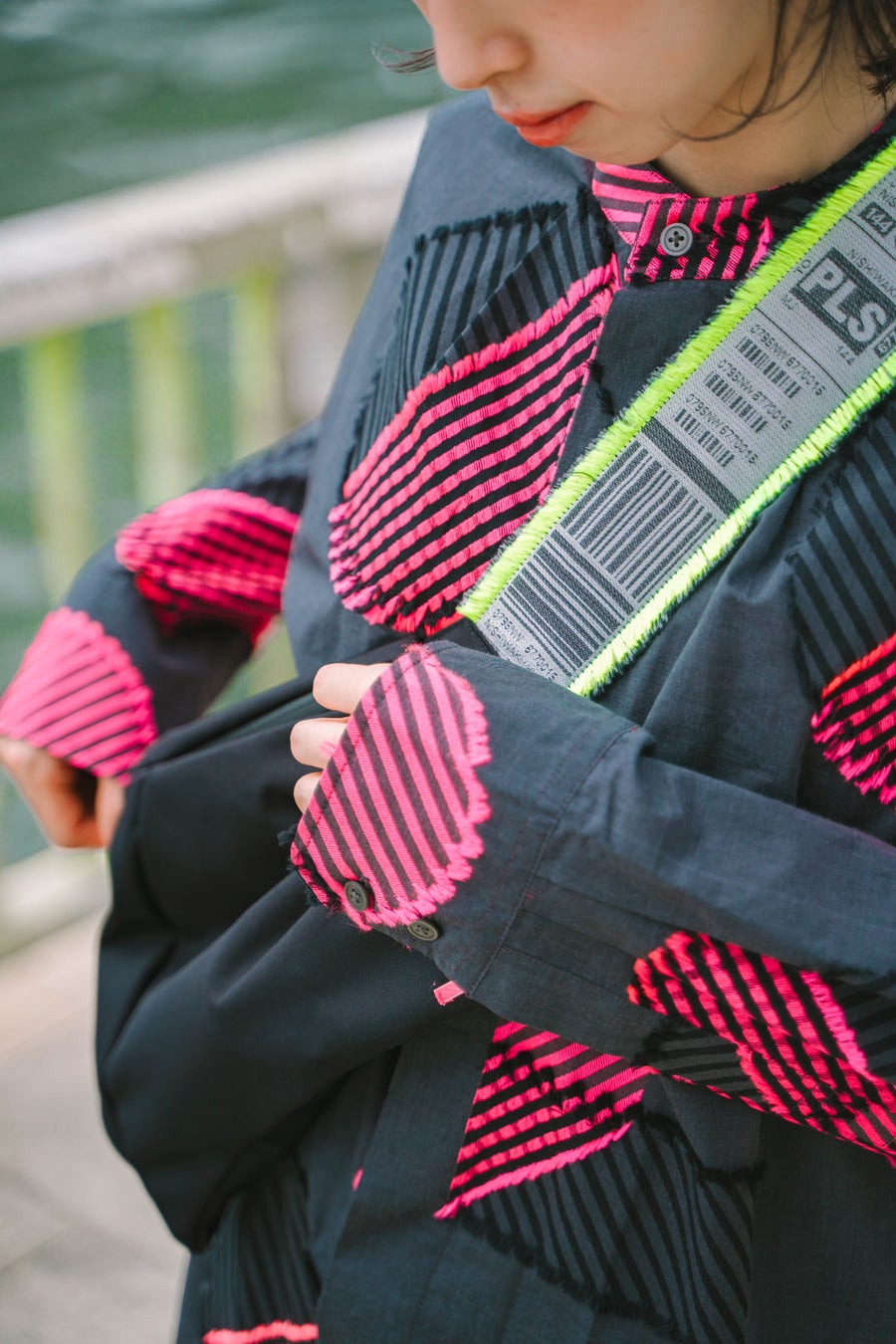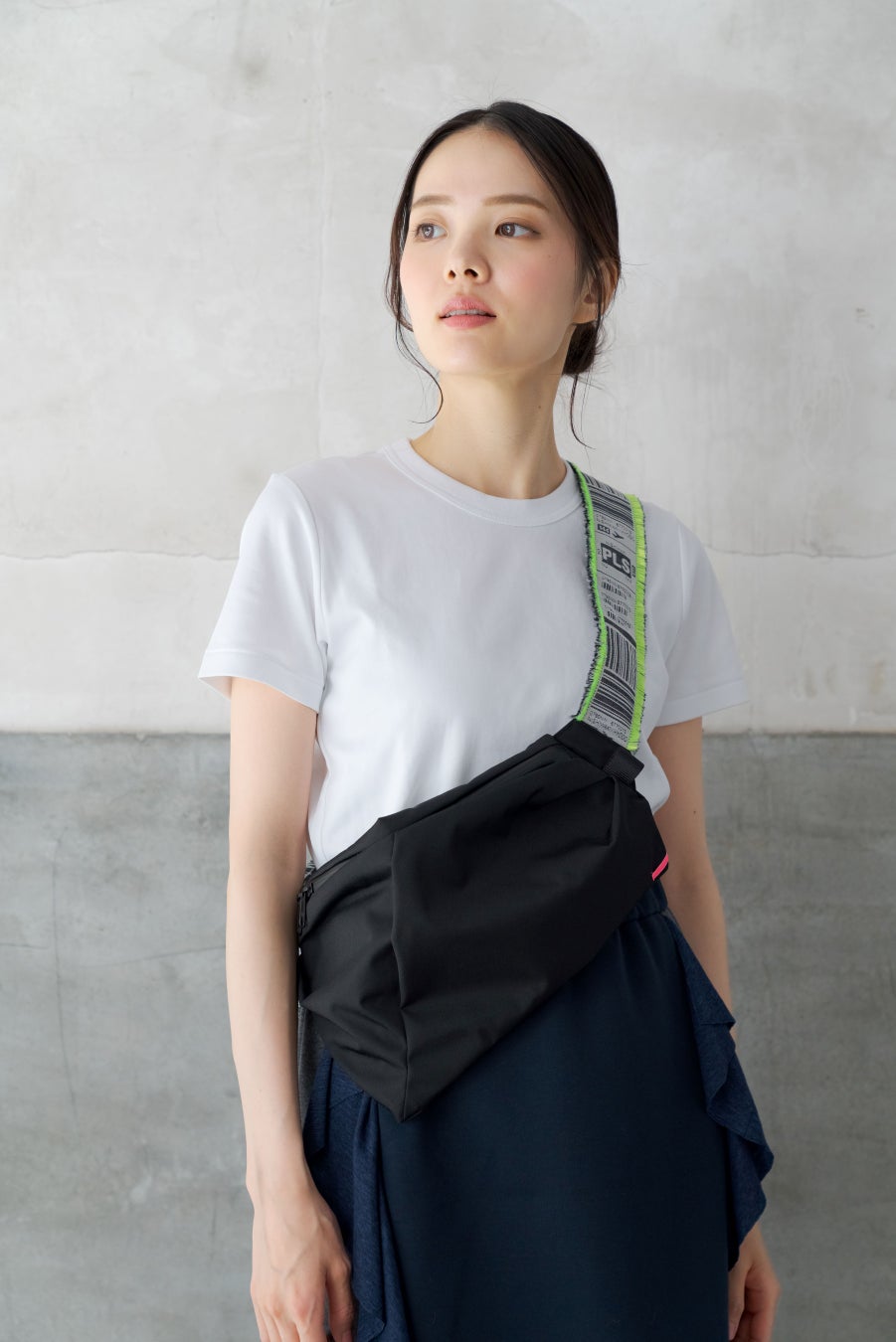 『 25SS - TRANSIT - 』今季のコレクションは、トップス/ボトムスなど 全4型(各2~3色)、バッグで構成している。初リリースのボディバッグは、ベルト部分にジャカード織を施している。オリジナルの播州織ジャカードは、フリンジカット技法やグラデーション高密度織物など、テキスタイル技術を突き詰めたモノづくりを行う。過去に購入歴がある方などには、テキスタイル付きのダイレクトメールをお届けする。今回は、アートワークのステッカーを追加する。