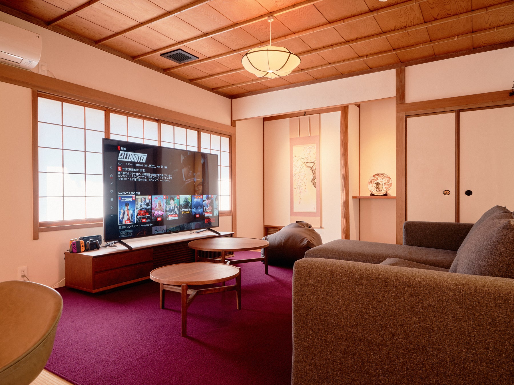 レトロな雰囲気を醸すインテリアに囲まれながら、大きな画面でテレビゲームやネットフリックスなどの各種配信サービスを楽しむことも可能です。