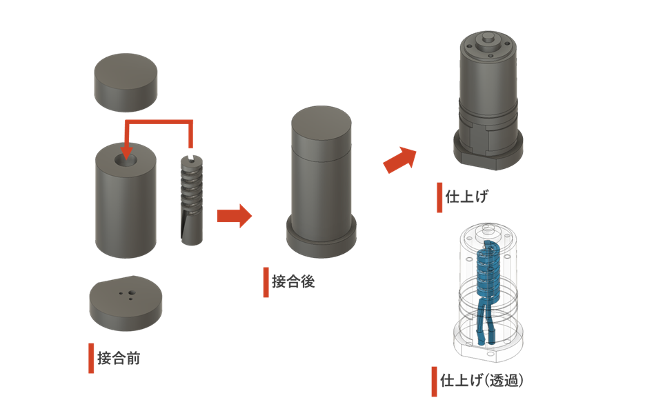 P-Basは、複数の金属部品や素材を、加圧しながら加熱することで一体化する技術です。従来、機械加工では難しく、金属3Dプリンタなどで製作していた、複雑形状の冷却水管などを含有する部品を、分割して製作し接合することで機械加工での製作を可能とする技術です。製造工数が少ない、材料費が安価、材質選択肢が多い、製品強度が高いなどのメリットがあり、お客様の生産性向上や原価低減に貢献します。