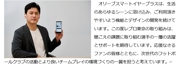 オリーブユニオンの最新機器である『Olive Smart Ear Plus(以下、オリーブスマートイヤープラス)』は無線通信を使⽤したソフトウェアをアップデートする機能であるOTAアップグレード※1による継続した機能更新と、独自の音声区間検出技術によって周囲の騒音を抑え、会話の声をクリアに届けるスマートイヤホンとして、聞こえづらさに悩む方をはじめとし、通話、音楽などの機能を楽しむすべての方の製品サービスの提供に務めています。この度、オリーブスマートイヤープラスをレプロ東京の選手に無償提供することで、ファンの皆様の声援とプレイ中の声がよりクリアに届きやすくなり、充実した活動環境の一助となることを期待しています。