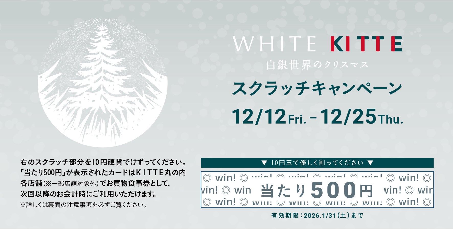 期間中、館内の同一店舗でお買い上げ3,000円(税込)ごとに、500円のお買物食事券が当たるスクラッチカードを1枚進呈するスクラッチキャンペーンを実施します。お買物食事券はKITTE対象店舗で2025年12月12日(金)~2026年1月31日(金)でご利用いただけます。