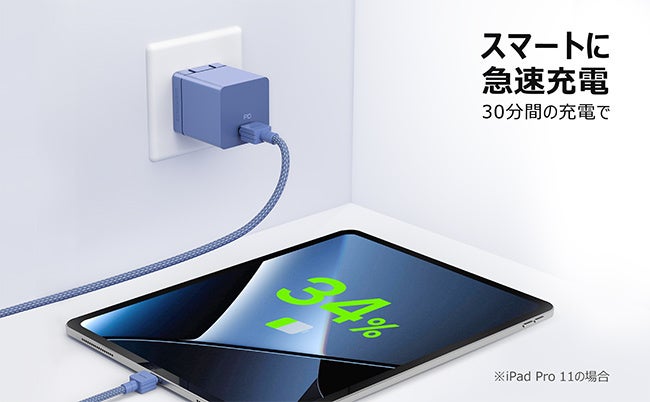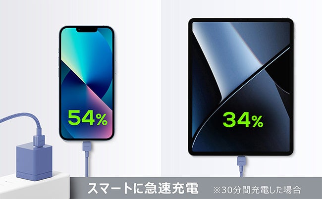 ※記載の数値については、自社テストにてiPhone 13 Pro MaxならびにiPad Pro 11を、充電0%の状態から30分間充電した場合の測定結果です。充電時間は環境要因によって実際の所要時間と異なる場合がございます。