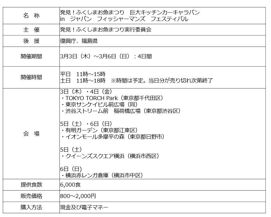 東日本大震災からまもなく11年を迎える福島県の漁業・水産業の応援を目的に、「常磐(じょうばん)もの」と呼ばれる福島の海の幸などを使った絶品魚介料理が味わえる「発見!ふくしまお魚まつり 巨大キッチンカーキャラバン in ジャパン フィッシャーマンズ フェスティバル」(主催・発見!ふくしまお魚まつり実行委員会)を3月3日(木)~6日(日)に開催します。