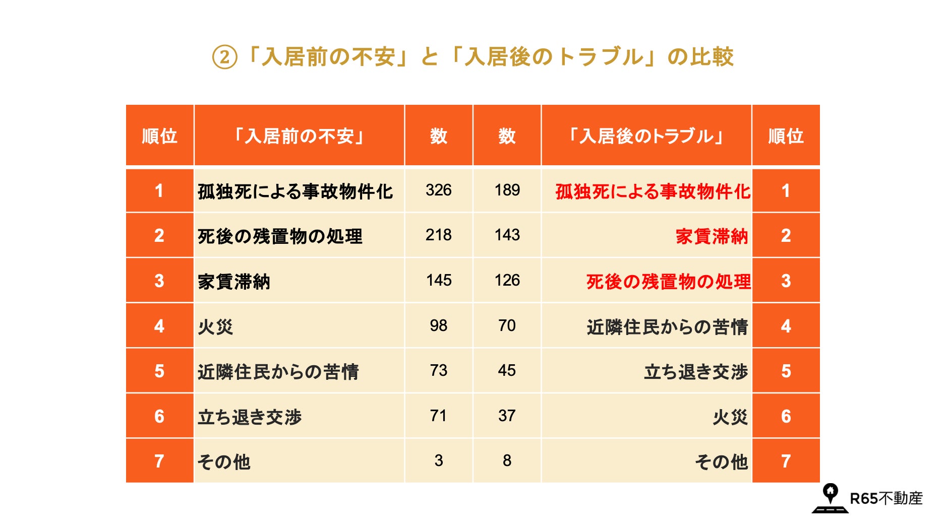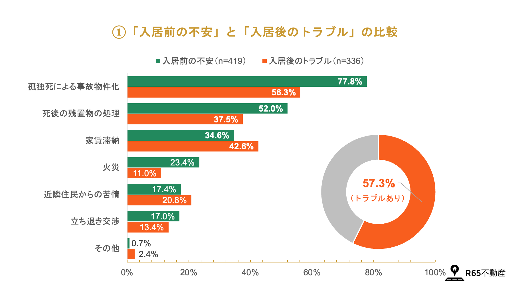 - ③高齢者の入居後に「実際にトラブルがあった」割合は57.3%。第1位が「孤独死による事故物件化(56.25%)」、第2位が想定を上回る「家賃滞納(42.6%)」、第3位が「死後の残置物の処理(37.5%)」。