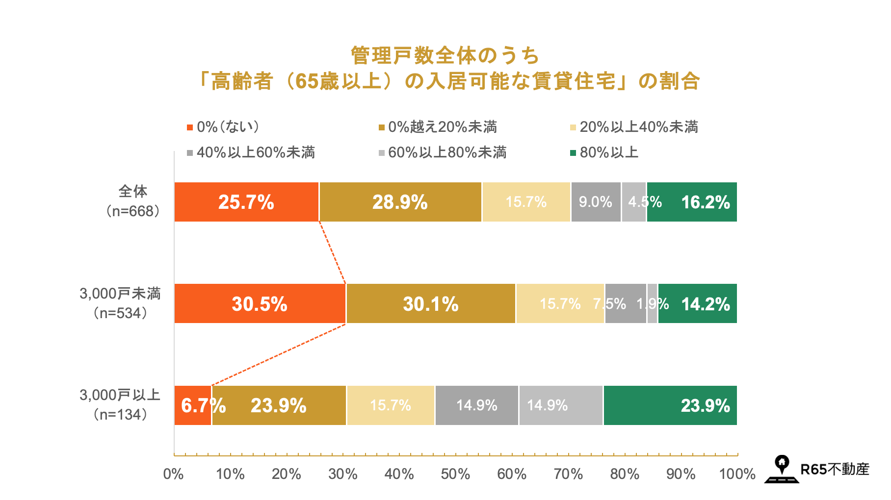 - 4社に1社(25.7%)が高齢者の入居可能な賃貸住宅が「全くない(0%)」状況で、過半数(54.6%)が「20%未満」。管理戸数が少ないほど顕著な傾向に。