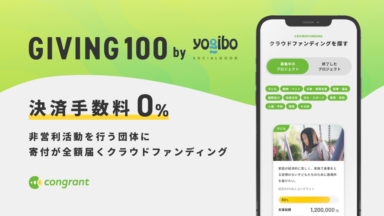NPO・非営利団体向け寄付決済システム「congrant(コングラント)」を提供するコングラント株式会社(本社:大阪市西区、代表取締役:佐藤正隆)は、「Yogibo」を展開する株式会社Yogibo(大阪市中央区、代表取締役:木村誠司)とのスポンサー契約により、決済手数料が0%になるクラウドファンディング「GIVING100 by Yogibo」の提供を開始しました。
