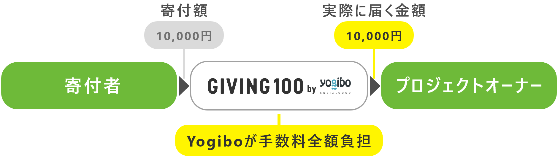 GIVING100の場合、寄付金100%が団体の社会課題解決の活動に使用される仕組みとして、より多くの寄付が社会に還元されることを目的としています。