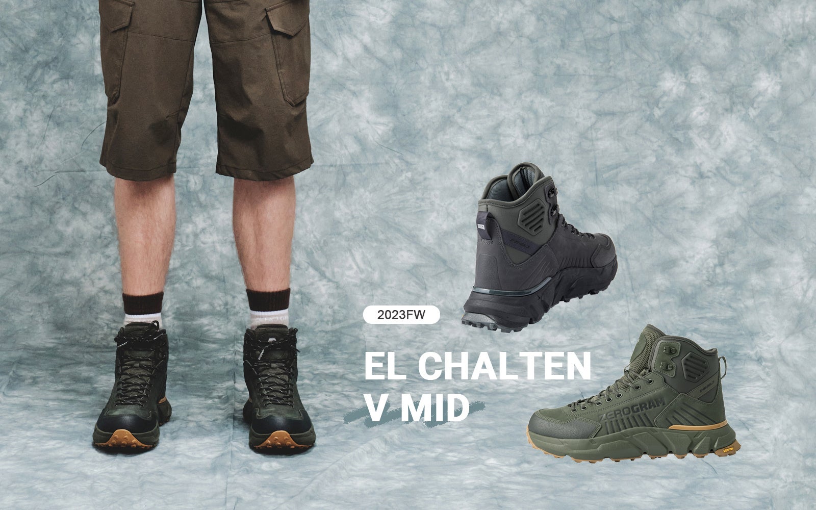 「El Chalten V Trekking Shoes Mid(エルチャルテン ブイ トレッキングシューズ ミドルカット)」はホールド力に優れた軽量トレッキングシューズで、昨年リリースした「El Chalten Trekking Shoes Mid」の環境配慮型バージョン。