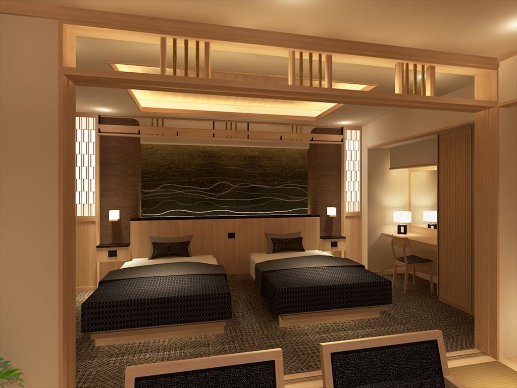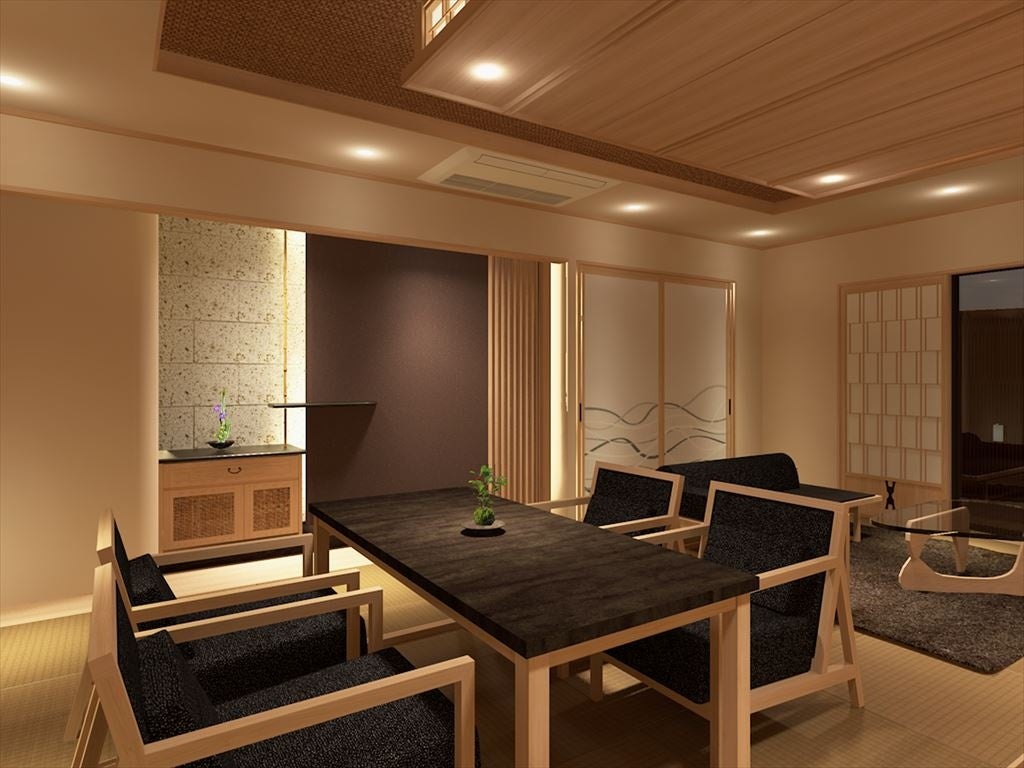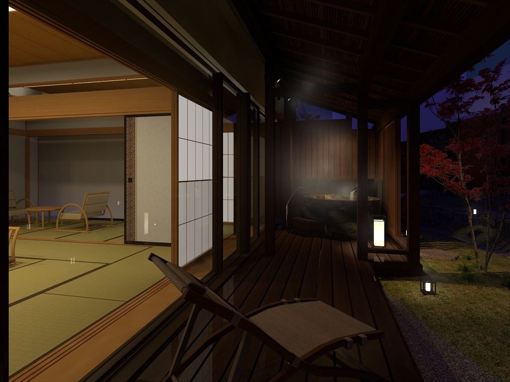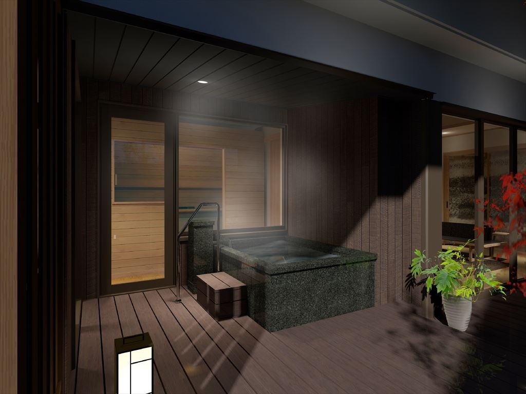 今回、同施設では合計3つの客室をサウナシアター露天風呂付きプレミアム客室と露天風呂付客室の2部屋へリニューアルする。