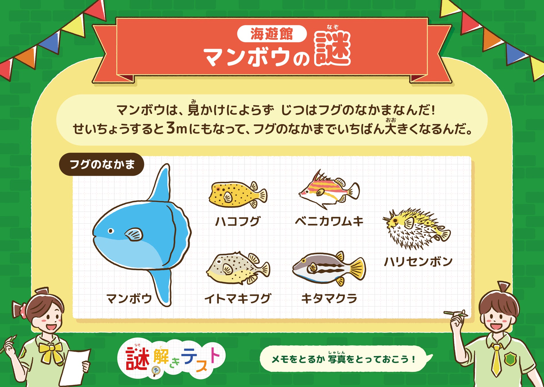 マンボウは実はフグの仲間?世界で一番おおきな虫は〇〇⁉…といったいきもの達の面白い生態やフシギについて、謎解きを通して楽しみながら学ぶことができます。小学校低学年のお子様から参加いただけるよう、全ての謎にヒントを用意しており、漢字にもフリガナが振られています。親子で楽しみながら謎解きに挑戦してみてください!(お母さん、お父さんのほうが夢中になってしまうかも?)