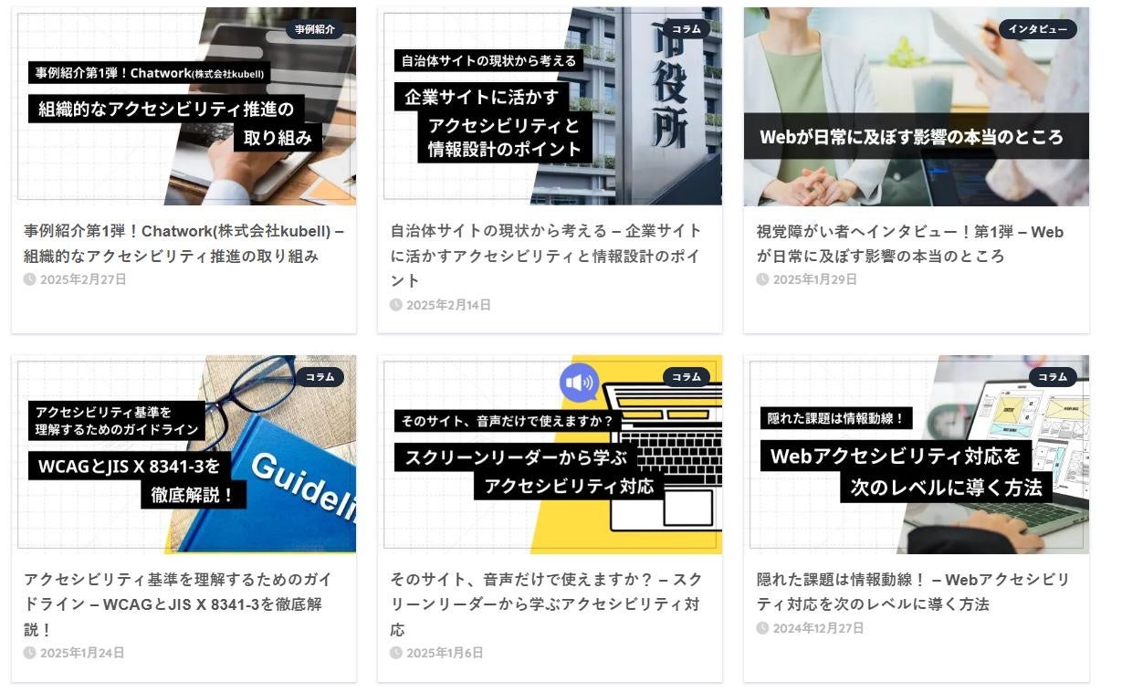 記事やコラム、動画インタビュー、イベントレポートなど、多彩なコンテンツでアクセシビリティにまつわる知識をわかりやすく紹介。専門用語の解説や事例分析も充実させ、実務レベルでの活用をサポートします。