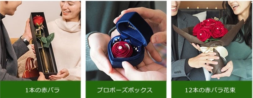 ○展示商品:1本の赤バラ(メッセージローズ)、12本の赤バラの花束、プロポーズボックス(全3商品予定)