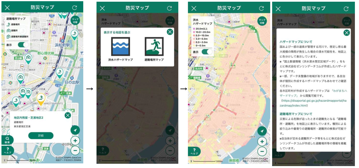 『防災マップ』機能は、同一マップ上で『洪水ハザードマップ』と『避難場所マップ』の表示を切り替えて確認することができる機能です。昨年度から、地図上で避難先の確認が可能な『避難場所マップ』を提供しておりますが、昨今の記録的な豪雨等による被害状況を踏まえ、9月1日(金)からは洪水・浸水想定区域を確認できる『洪水ハザードマップ』を追加し、より、防災に関する情報の把握に役立つ機能にアップデートいたしました。