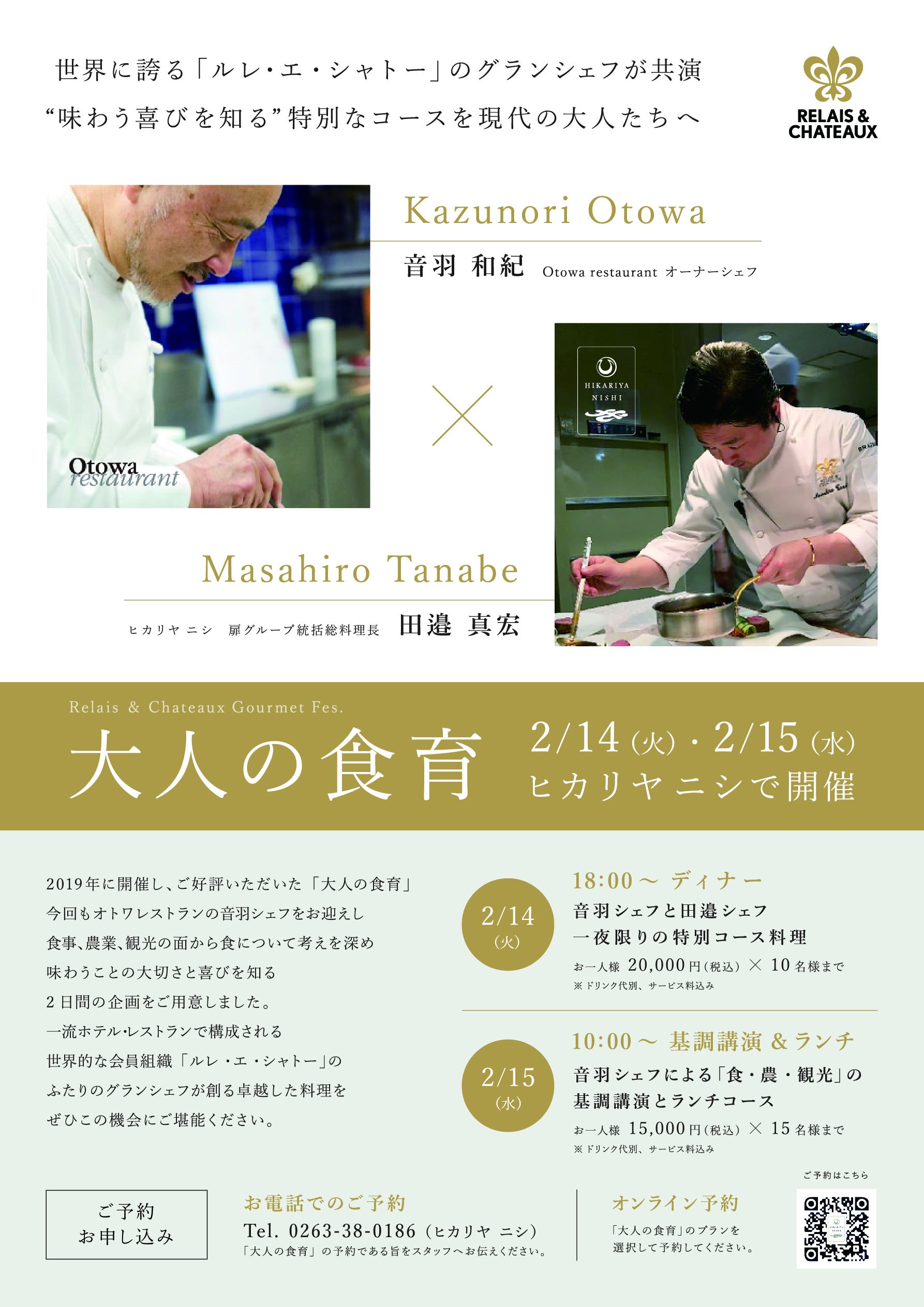 扉ホールディングス株式会社(長野県松本市深志 代表取締役社長:齊藤忠政)は、当社が運営するナチュレフレンチレストラン「ヒカリヤ ニシ(長野県松本市大手)」にて、2019年に開催し好評を博した「大人の食育」を2年ぶりに開催します。「大人の食育」とは、その土地の食文化を未来へ伝えていくために、現代の大人たちに向け「食・農・観光」について理解を深め、味わうことの大切さと喜びを知ってもらうことを目的とした企画で、2回目となる今回も、世界的なホテル・レストランの会員組織「ルレ・エ・シャトー」に加盟するオトワレストラン(栃木県宇都宮市)の音羽和紀オーナーシェフをお迎えし、同じく「ルレ・エ・シャトー」に加盟する「ヒカリヤ ニシ」「扉温泉明神館(長野県松本市入山辺)」の扉グループ統括総料理長を務める田邉真宏とのコラボレーションにより創られる本企画限定の特別なコース料理をご用意いたします。
