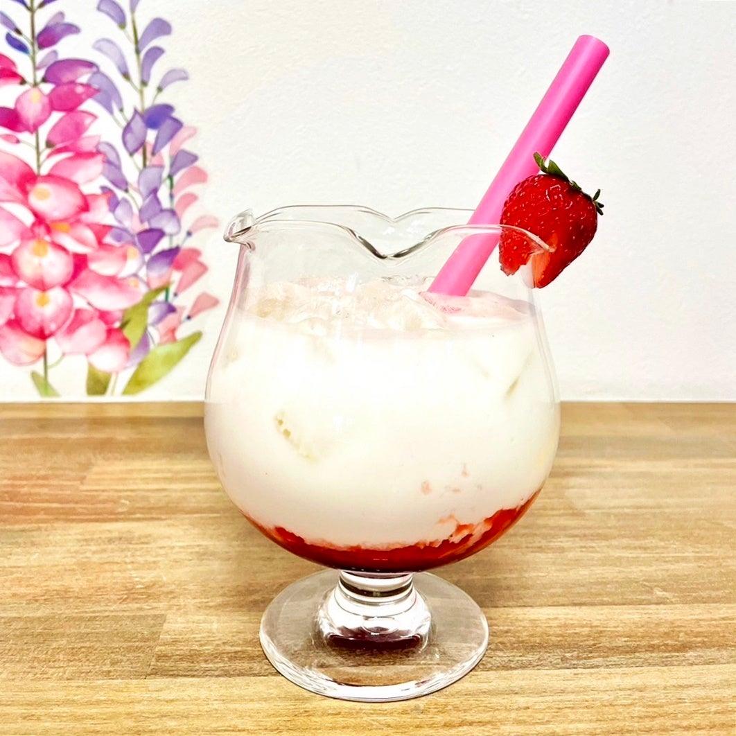 金魚鉢型のグラスで提供。混ぜると美しいピンク色に変わり、見た目にも楽しい一品です。