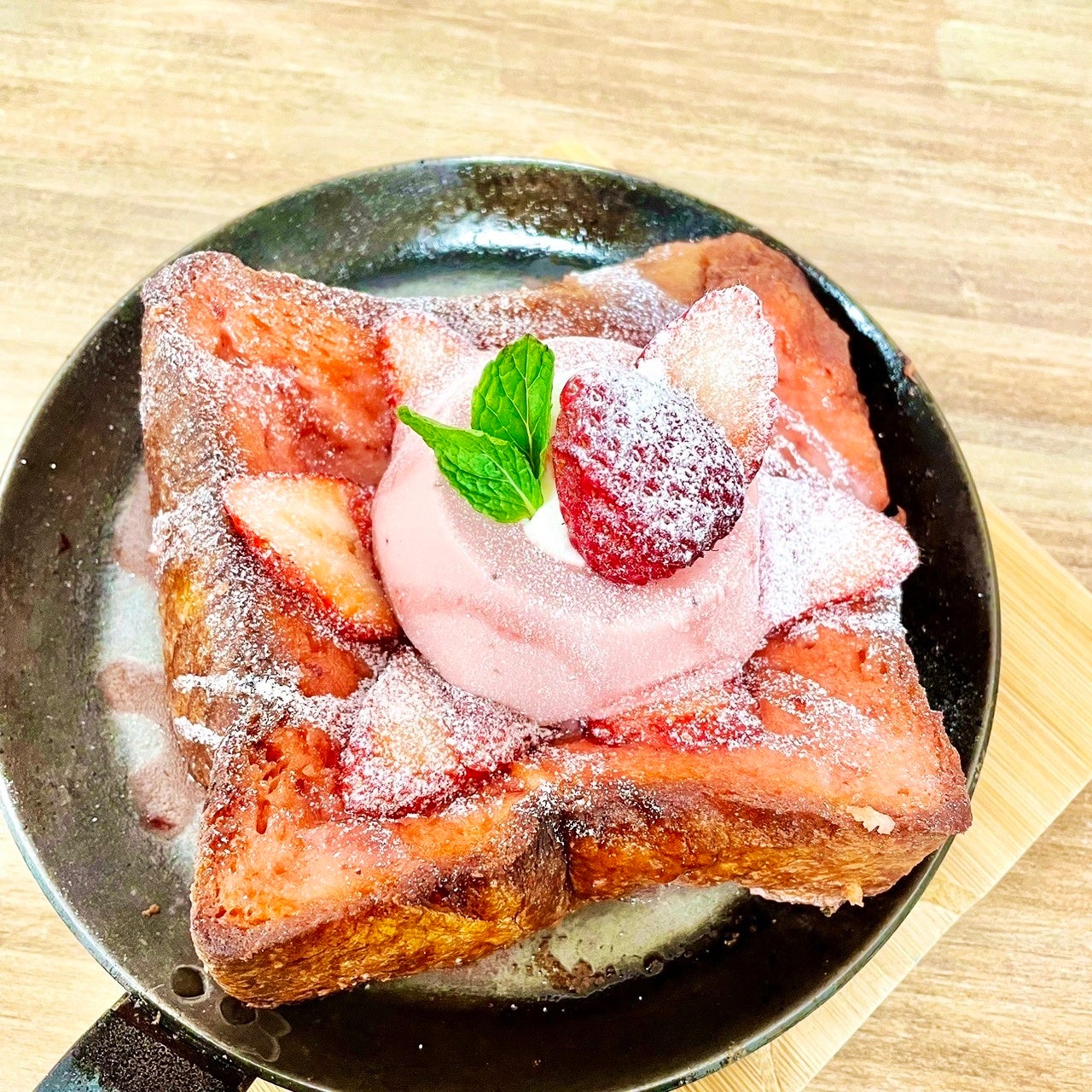 苺みるくプリン液に漬け込んだデニッシュパンに、スライス苺と苺プリンをトッピング。アルバイト発案の斬新なデザートトーストです。鉄板の上で提供することで提供時にプリンが溶け出し、食べ進めるほどにピンクカラーに変化します。