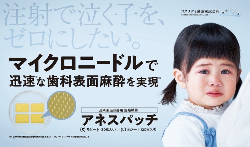 コスメディ製薬株式会社(本社:京都市/代表取締役社長:権 英淑)は、マイクロニードル技術を歯科表面麻酔に応用した医療機器『アネスパッチ』(以下、本製品)を2023年10月10日に発売しましたのでお知らせします。本製品は2008年に世界で初めて*1マイクロニードル化粧品を製品化し、薬効成分を皮膚から吸収させるTTS(経皮吸収システム)技術で独創的な製品展開をする当社が、初めて発売する医療機器です。