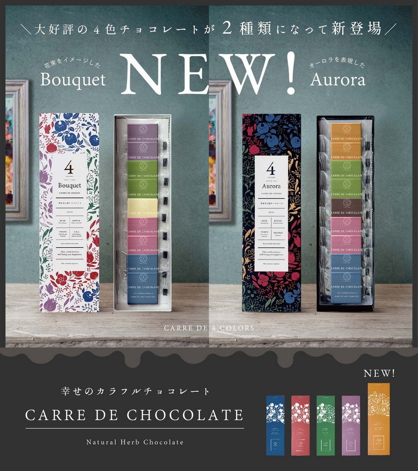 今年は新たに闇夜のオーロラをテーマにした4色アソート『Carre de aurora(カレ・ド・オーロラ)』、ターメリックを使用したオレンジ色のチョコレート『Carre de orange(カレ・ド・オランジュ) 』、国産玄米クランチが入った食べ応えのあるハンドメイドチョコレート『Carre de crunch CLAIR (カレドクランチ クレール)』の三種類の商品がバレンタインや冬ギフト、推し色チョコとして大人気の『幸せを呼ぶ青いチョコレートシリーズ』に仲間入り。